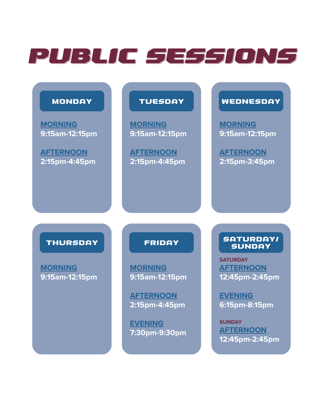 Experience the thrill of skating at our public sessions, open to everyone from beginners to seasoned skaters. Whether youβre looking for a fun outing with family and friends or just want to glide around the rink, our public skating sessions offer the perfect opportunity to enjoy the ice. With a lively atmosphere, great music, and skate rentals available, it's a fun and affordable way to stay active and make lasting memories.